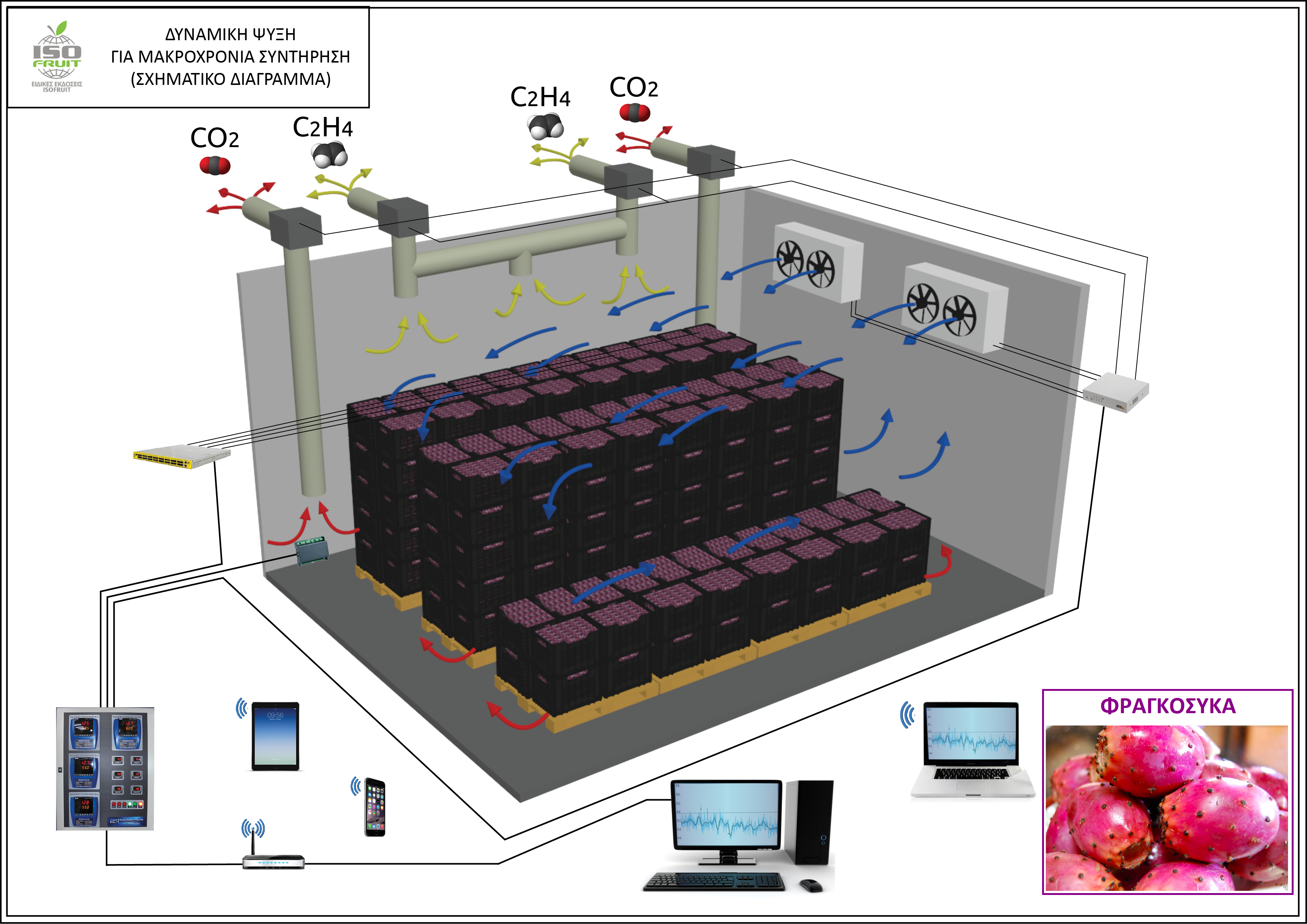 Ψυκτικός θάλαμος δυναμικής ψύξης μακροχρόνιας συντήρησης και σχηματική απεικόνιση των εξαρτημάτων ελέγχου και ρύθμισης των παραμέτρων λειτουργίας.