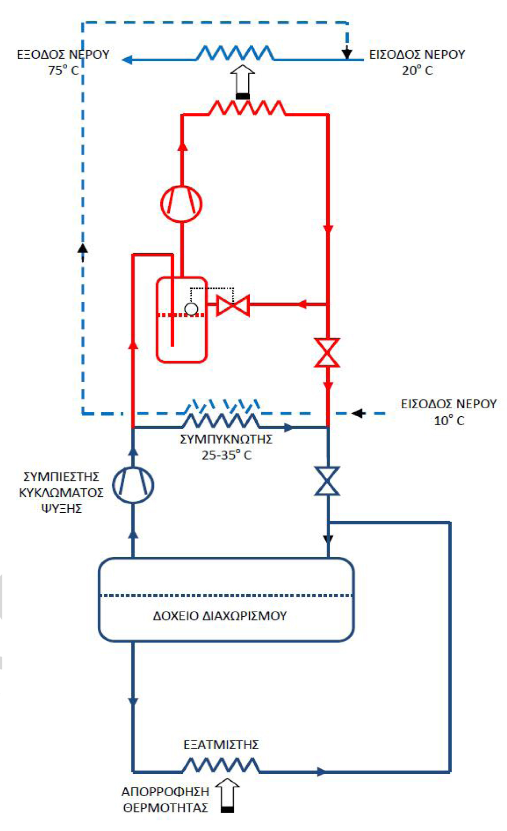 Η διάταξη του σχήματος προβλέπει ψύξη του ατμού κατάθλιψης του χαμηλού συμπιεστή πριν την αναρρόφησή του από τον ψηλό σε δοχείο, όπου διατηρείται υγρό στην πίεση αναρρόφησης του ψηλού συμπιεστή. Έτσι αποφεύγεται η υπερβολική θερμοκρασία του υπέρθερμου ατμού κατάθλιψης του ψηλού συμπιεστή. Η απαιτούμενη θερμική ικανότητα της αντλίας θερμότητας ορίζεται από την απαίτηση παροχής μάζας του νερού χρήσης και από την απαιτούμενη άνοδο της θερμοκρασίας του. Στο παράδειγμα του σχήματος (θέρμανση νερού από 20 σε 75°C), αν η απαιτούμενη παροχή θερμού νερού είναι 5000 m3/h (1,39 m3/s), η απαιτούμενη θερμική ισχύς είναι 1,39 x 4,19 x (75-20) = 320,3 KW. Η εκάστοτε απαιτούμενη θερμική ισχύς «μεταφράζεται» σε (απαιτούμενη) παροχή ψυκτικού ρευστού (π.χ. αμμωνίας) που πρέπει να διέρχεται από τον «ψηλό» συμπιεστή (και «ψηλό» συμπυκνωτή)2 και κατ’ επέκταση στην απαιτούμενη μετατόπιση του «ψηλού» συμπιεστή (capacity control)3. Όλο το απομένον συμπιεσμένο αέριο από τον «χαμηλό» συμπιεστή (μετά την ικανοποίηση της θερμικής απαίτησης) συμπυκνώνεται στον «χαμηλό» συμπυκνωτή.