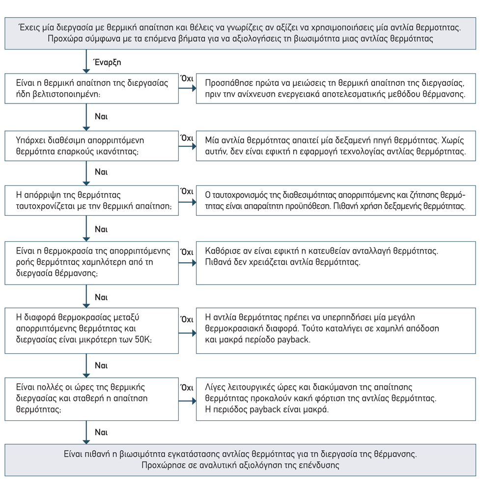 Συνήθως στις βιομηχανικές παραγωγές υπάρχουν από τη μια απορριπτόμενες θερμότητες και από την άλλη ανάγκες θέρμανσης. Δεν είναι προφανές, το κατά πόσο μπορούμε να επωφεληθούμε από χρήση των απορριπτόμενων θερμοτήτων. Υπάρχουν τρία θέματα που πρέπει να διερευνηθούν, πριν καταλήξουμε στην απόφαση: