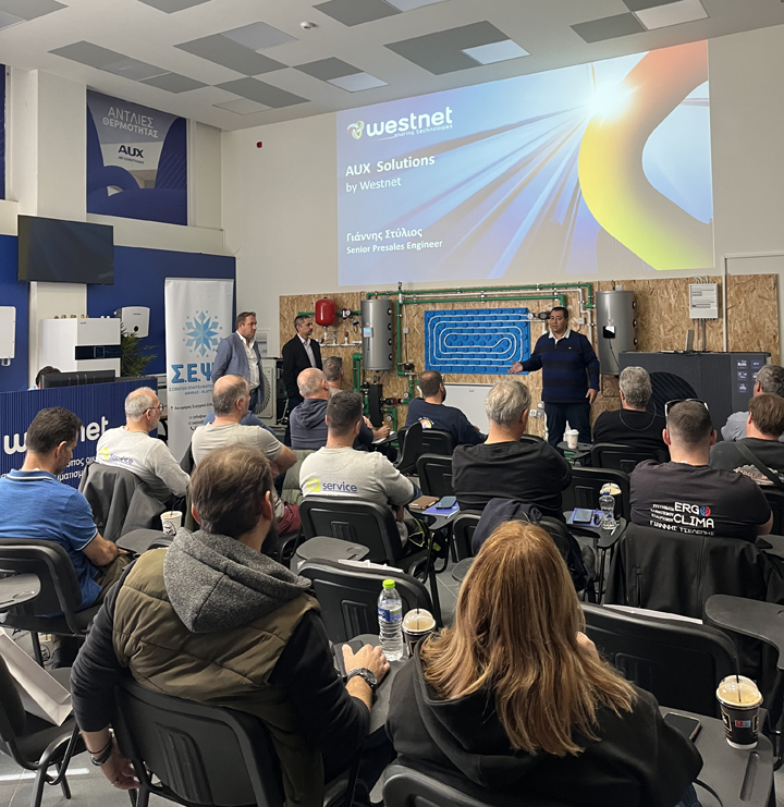 Σε συνεργασία με τον ΣΕΨΑ, πραγματοποιήθηκε στο σύγχρονο και πλήρως εξοπλισμένο εκπαιδευτικό κέντρο της Westnet, το AUX Experience Center, μία ακόμη σειρά τεχνικών σεμιναρίων αφιερωμένων στην τεχνολογία και τα πλεονεκτήματα των αντλιών θερμότητας και των συστημάτων VRV.